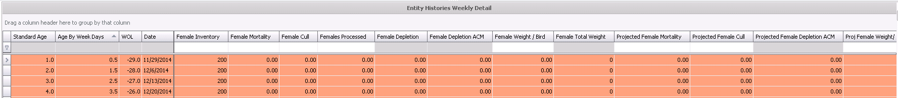 The Weekly Detail section displays the historical entity data from placement to end of lay. Data must be imported using the import options. The import will update the projected data with actual data from BIM. After the new data has been imported then the flock must be calculated using the