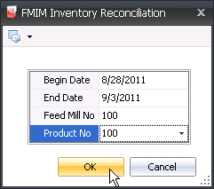 The Finished Feed Inventory Reconciliation provides the details for all of the transactions in a specified period to determine the valuation. All transactions that related to the product will be listed in the inventory reconciliation to determine the quantity and valuation of the product. The transactions will be valued based on FIFO or Average Cost as defined in the feed mill registry.