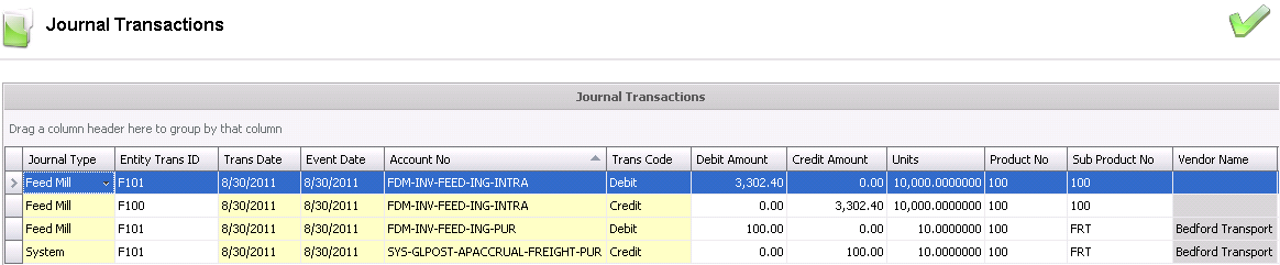 The posting process creates the journal transaction. The journal process will credit the source feed mill inventory and debit the destination feed mill inventory. The initial journal will credit the source mill for the feed formula at the defined feed formula price and debit the destination mill.