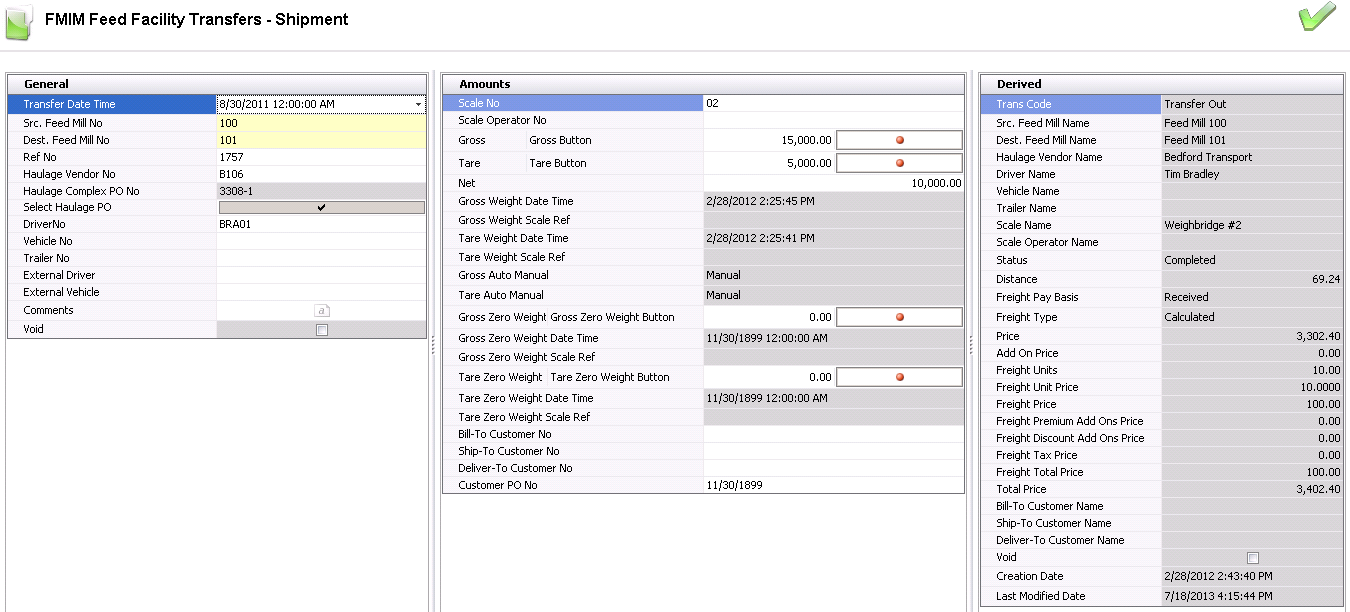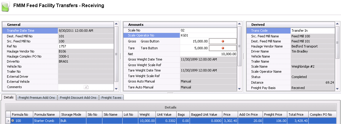 Price displays the total feed formula amount. Price = Units Transferred x Unit Price.