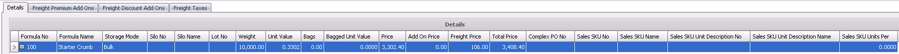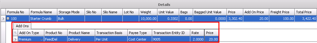 Within the Details tab, there is a child grid with additional details relating to the transfer add-ons. Any add-ons must be previously defined in Feed Formula Prices.