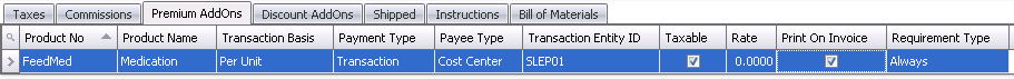 In the child grid, there is the option to define the add-ons related to the product. The add-ons must be pre-defined in General>Products>AddOns prior to adding to the sales sku. Add-ons must be defined on the sales SKU and then the corresponding contracts and price masters before defaulting to the order.