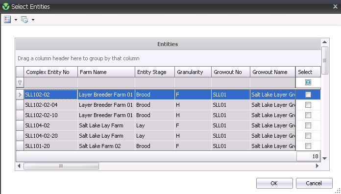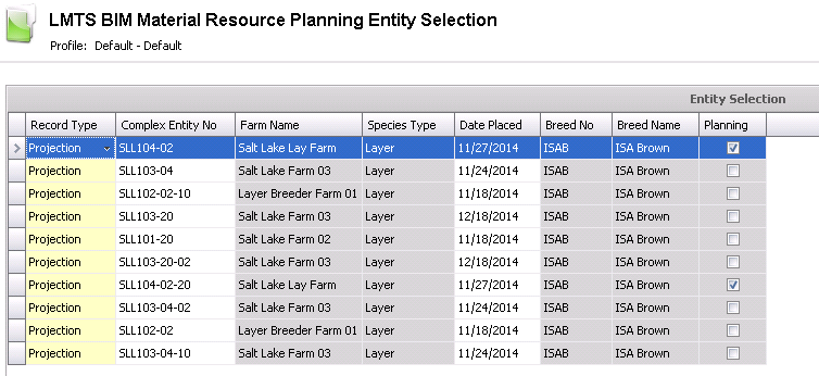 The MRP Entity Selection screen allows the user to select the entities that will be used in the planning process which will determine the product required throughout the life cycle of the entity. In order for the products to be planned, the BOM Packages must be assigned to the entity product, and a Profile must first be created. The BOM Package is assigned to the product in General>General>Products>Animals>Poultry.