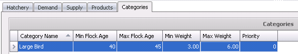 The Categories tab further defines the projection into user defined categories based upon bird age and weight.