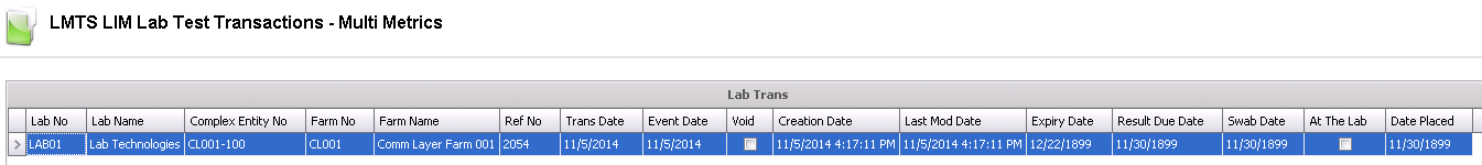 Lab tests are designed to record the test analysis administered to an entity and ensure that the eggs meet the standard requirements before processing and shipping to the customer. These test and the results are recorded in Lab Test. The lab test transaction identifies the product and feed mill being tested and the laboratory doing the testing.