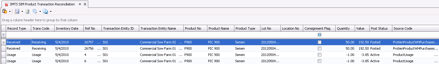Transaction Reconciliation screen is view only. Transaction reconciles where  the cost of a specific transaction is derived based on the transaction details entered in the system.  The screen is viewed based upon a beginning and ending date as well as farm and product. Each transaction that affects  the inventory will be displayed.
