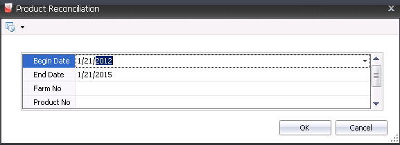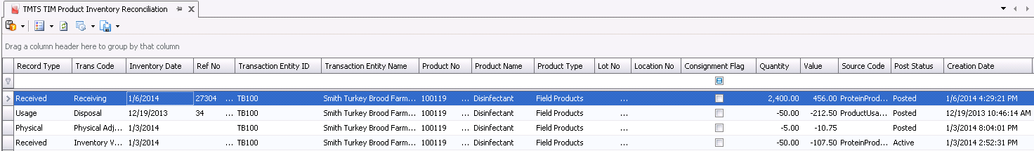 The reconciliation can be run for a specified date range, farm and product. Once the data is generated, the screen can be filtered and grouped as required to view more specific data.