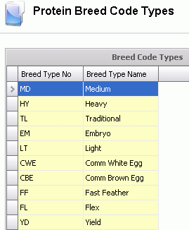 Breed Code Types are used to group flocks based on how they are managed. Breed Code Types are used throughout the system, but largely by FDSA to assign Feeding Programs, BPA Planning and by BRPA to forecast kill schedules. The user may filter the fields for the required option.