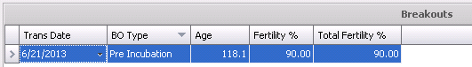 The information in the Breakout tab is derived from the HIM>Breakout>Transactions. The fertility percentages posts back to the flock, age and production date of the eggs in this screen.