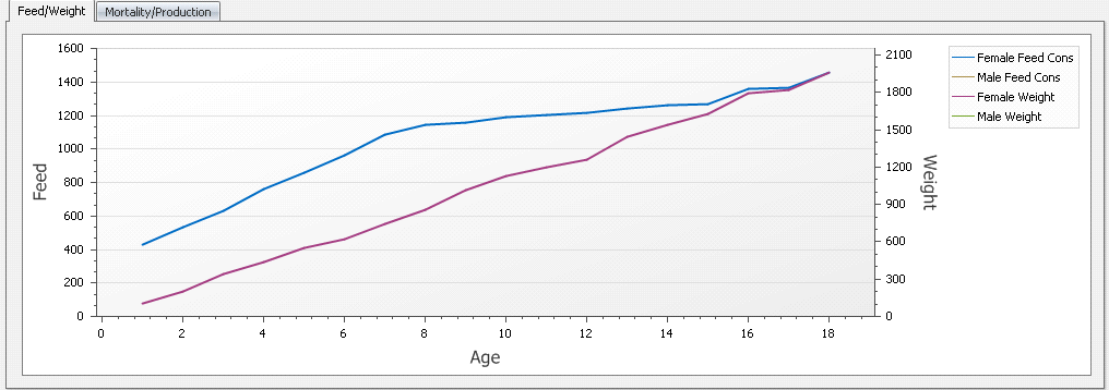 The Feed/Weight chart is a comparison for bird growth, comparing the feed consumed to the weight of the birds in order to show feed conversion.