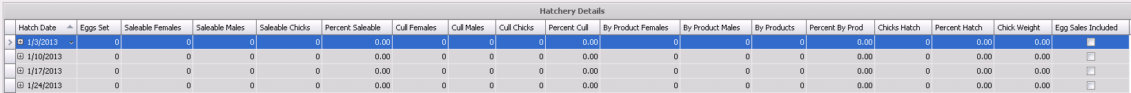 The information in the Hatchery Detail tab is derived from HIM Eggs Set and Chicks Hatched transactions, and is only used for Lay Entities.