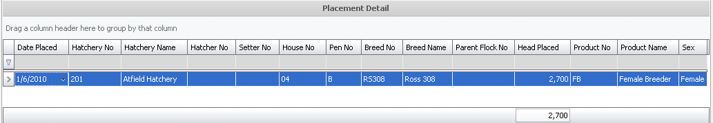 The Placement Detail tab contains the details of the number of chicks placed from each donor source or parent, and is derived from the purchase order (if defined) or internal placements (HIM Breeder/Broiler Placements).