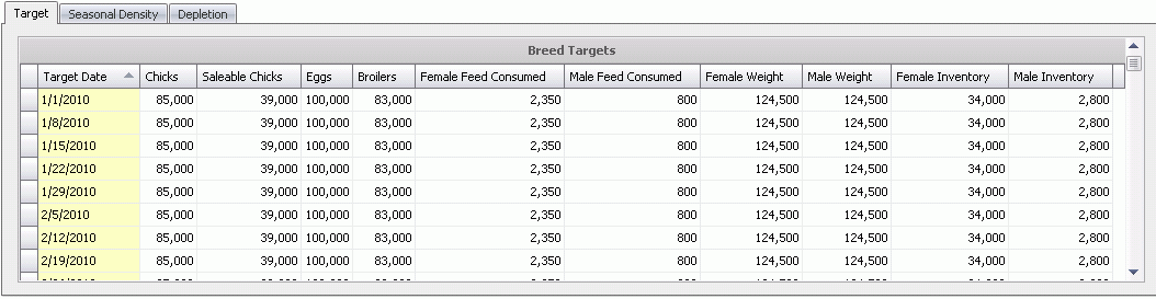 indicates the number of saleable chicks required for each target date.