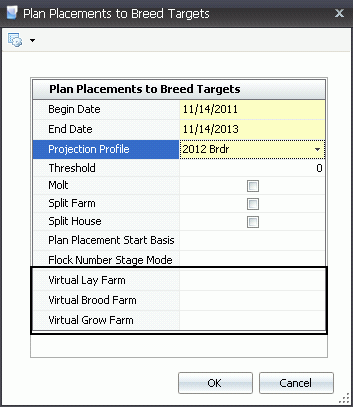 Select the Virtual Brood Farm. If Targets project more birds than there are houses, the Virtual Farm will allow the system to keep placing birds into virtual houses until the target is met. Virtual Farms must be set up in BIM.