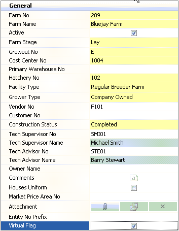The Virtual Flag must be checked to identify the farm as a virtual farm. Only one virtual farm for each entity stage is required (Brood, Grow and Lay).