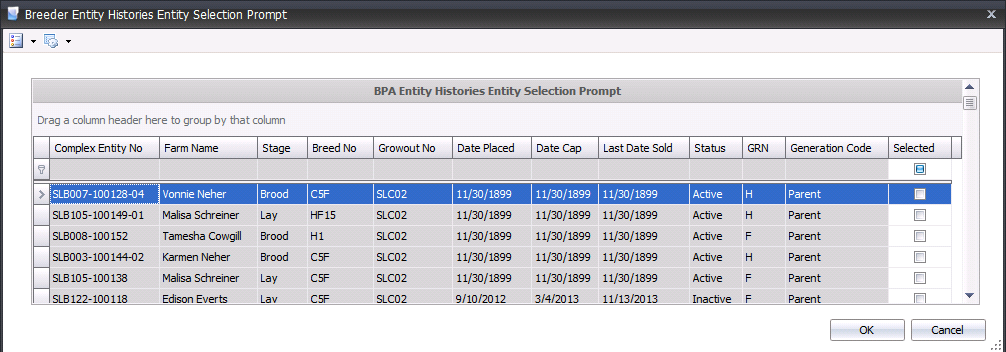 In the Entities History Entity Selection Prompt, click on the Selected box for all that apply to the profile being created. Click 'OK' and the information will be added to the Entities section. All data fields will be populated based upon the entity selections. The data is derived from Entities in BIM.