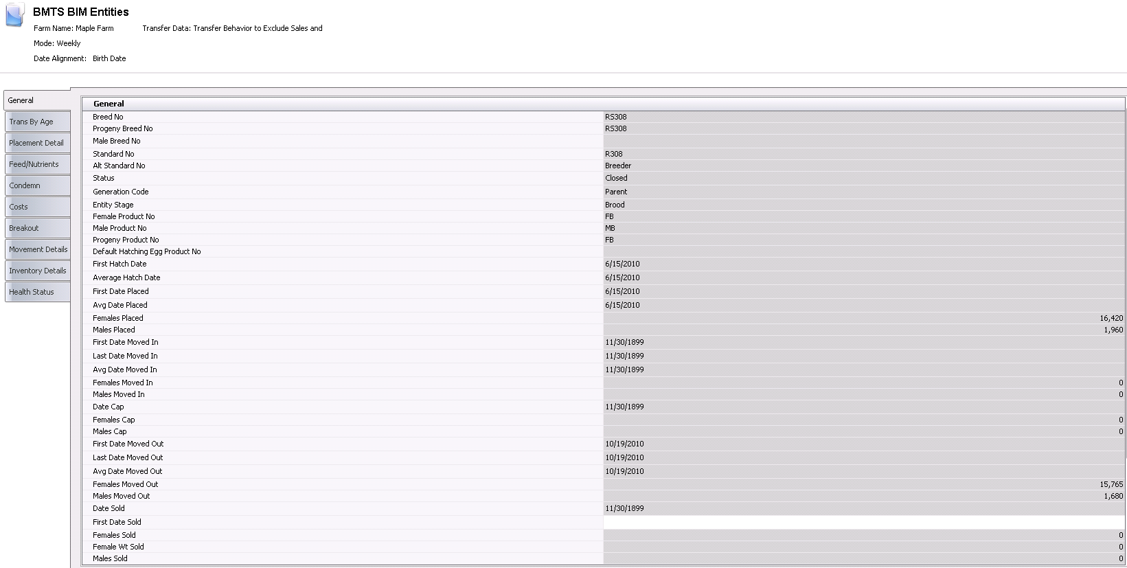 Avg Date Moved Out indicates the average date the birds were moved out of the house. If posted from BPA, the date moved out is calculated based upon the Transfer Age in Breed Target. If the flock is created manually, the date will be derived from the Transfer Transaction at the time of transfer. If the entity is 'Brood' stage, at 24 weeks, the entity will be moved or transferred to the lay house. If the flock is 'Lay' stage, the moved date will represent the date the birds were sold.