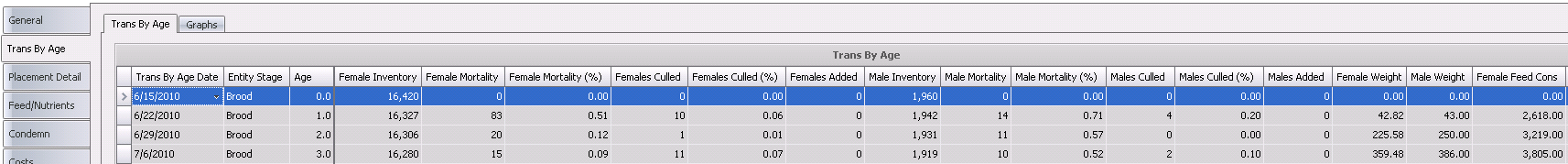 First Date Moved Out indicates the first date the birds were moved out of the house. If posted from BPA, the date moved out is calculated based upon the Transfer Age in Breed Target. If the flock is created manually, the date will be derived from the Transfer Transaction at the time of transfer. If the entity is 'Brood' stage, at 24 weeks, the entity will be moved or transferred to the lay house. If the flock is 'Lay' stage, the moved date will represent the date the birds were sold.