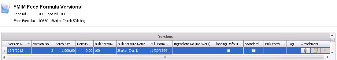Bagged feed versions are created automatically when a repack transaction is created to bag the feed. The bagged feed formula must be configured as outlined in Bagged Feed Formula for the repack process to properly assign and maintain the links to the bulk feed formula versions. New versions are not manually created for bagged feed.