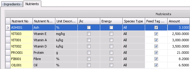 Nutrients must be defined on the feed formula. Once defined on the feed formula, the nutrients will default to the feed formula version where the values can then be assigned.