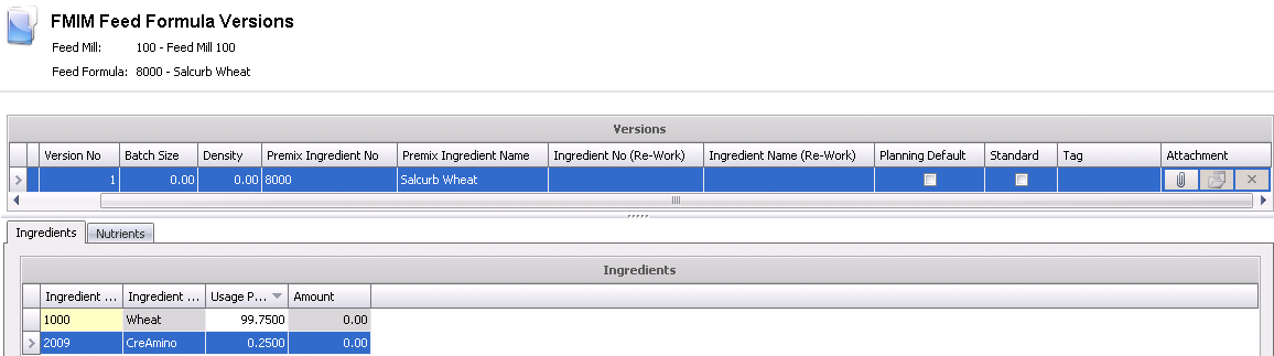 The ingredients tab defines the ingredients that are used to create the pre-mix. The feed production transaction will create usage transactions for the ingredients that are used to produce the pre-mix.