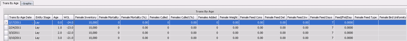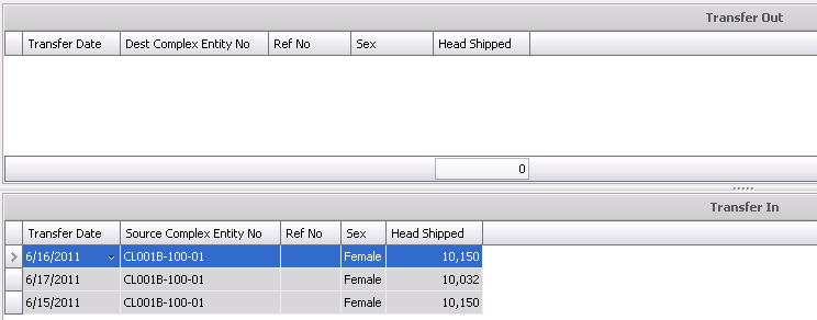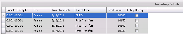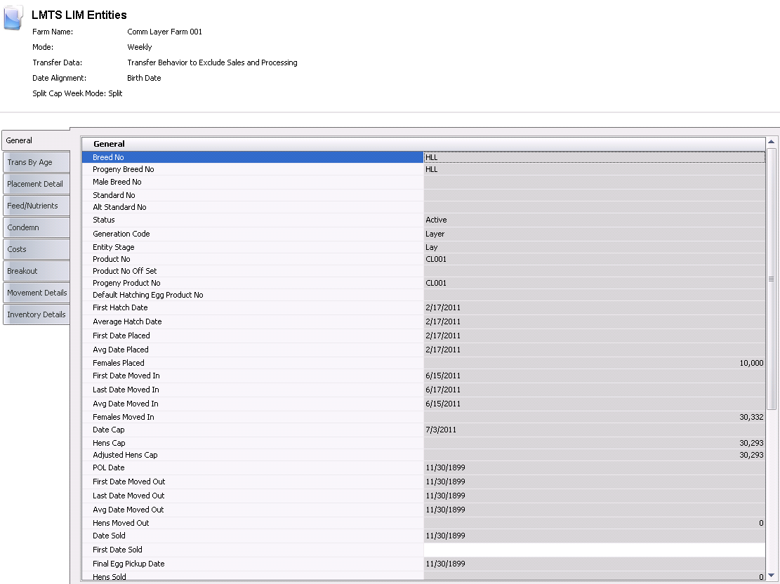 Last Date Moved Out indicates the last date the birds were moved out of the house. If posted from BPA, the date moved out is calculated based upon the Transfer Age in Breed Target. If the flock is created manually, the date will be derived from the Transfer Transaction at the time of transfer. If the entity is 'Brood' stage, at 24 weeks, the entity will be moved or transferred to the lay house. If the flock is 'Lay' stage, the moved date will represent the date the birds were sold.