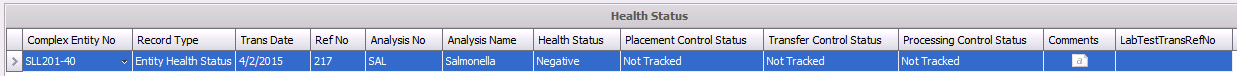 The Health Status tab represents the most recent health status transactions based on the Lab Test transaction and/Entity Status transaction. The Entity Status transaction will always override the lab test transaction for the same test code. The variables of the health status are user defined in Lab Test Codes.