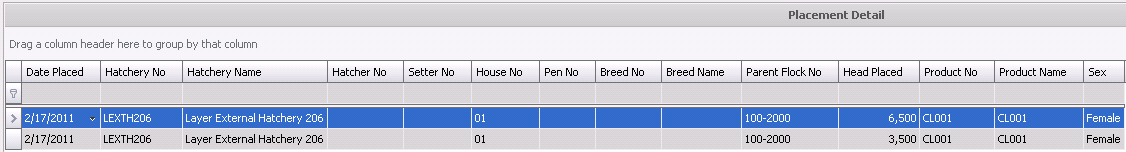 The Placement Detail tab contains the details of the number of chicks placed from each donor source or parent, and is derived from the purchase order (if defined) or internal placements (HIM Breeder/Layer Placements).