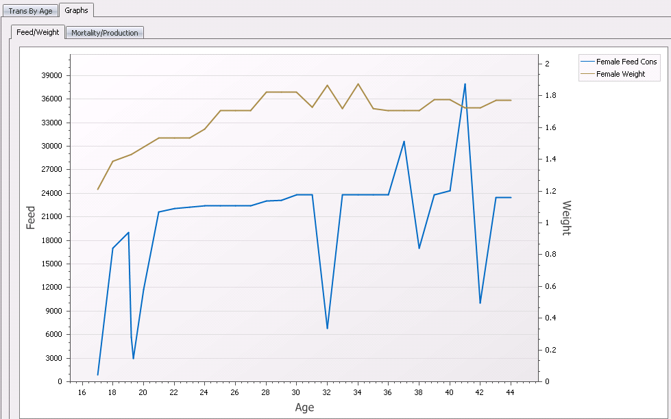 The Feed/Weight chart is a comparison for bird growth, comparing the feed consumed to the weight of the birds in order to show feed conversion.