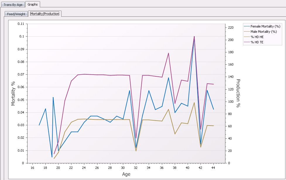 The Mortality/Production chart is a comparison for egg production against mortality, showing how the mortality affects the egg production