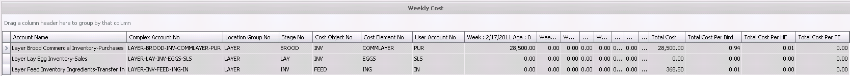 The Costs tab represents all of the costs associated with the flock and is broken down by the accounts set-up in the Chart of Accounts Master. Costs are derived from the journal transactions.