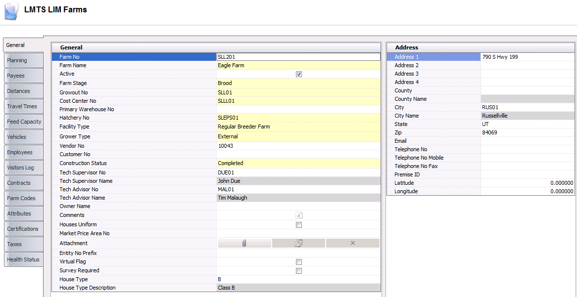 as address, farm stage, and cost center details. There are two components