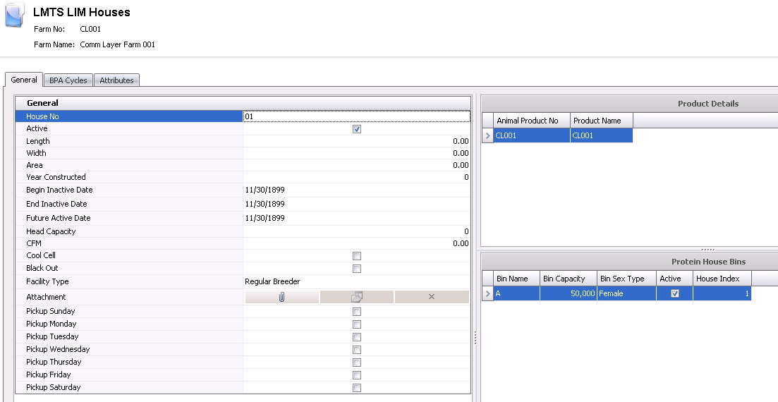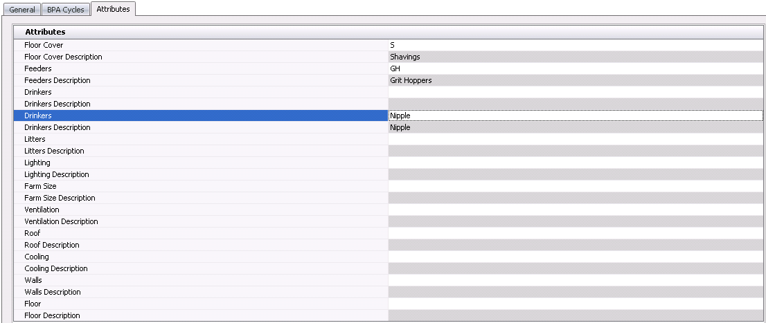 Attributes are assigned to farms and houses are defined in: Admin>Business>General>Definitions>Attributes. When a new entity is created, the attributes default in with an option for the user to modify.