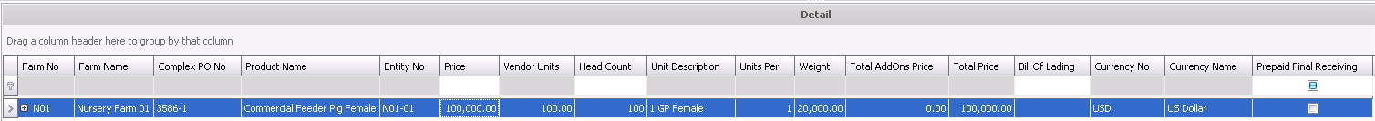 The farm receiving transaction consists of two sections. The header is used to enter the base data for the farm receiving transaction, while the Details default in from the selected receiving purchase order.